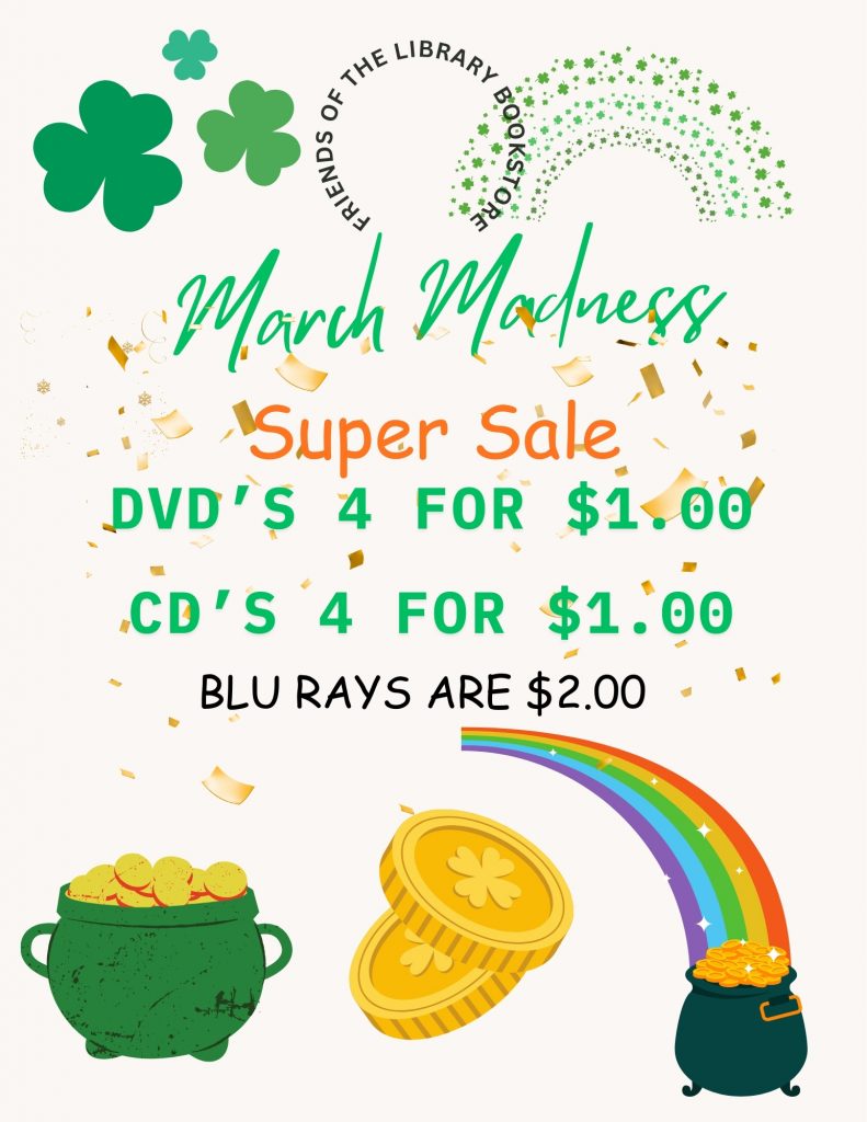As of January 1, 2018, book prices are as follows: Saturday Bag of Book price – Members $5 and Non-members $8. The price for regular paperback books is 50 cents each, and both trade paperbacks, large paperbacks and hardcover books are $1.00 each. DVDs are $1.00 each, CDs 2 for $1. Blu-ray discs $2.00 each. Members enjoy a 25% discount on other purchases.